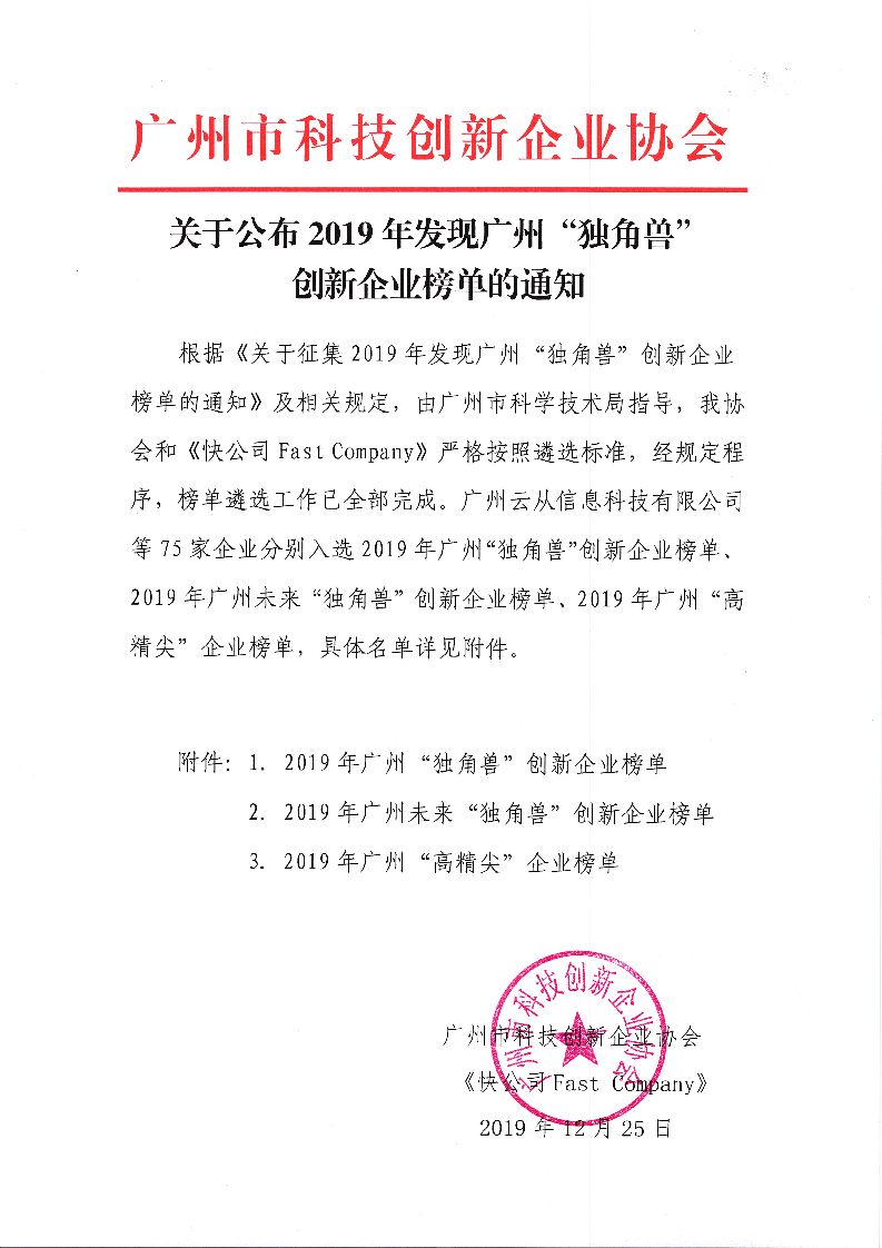 12月27日,发现广州“独角兽”创新企业活动公布最新成果,广州市康立明生物科技有限责任公司等45家企业入选2019年广州未来“独角兽”创新企业榜单。该活动由广州市科学技术局指导,广州市科技创新企业协会和《快公司Fast Company》联合主办,广州产业投资基金管理有限公司协办。